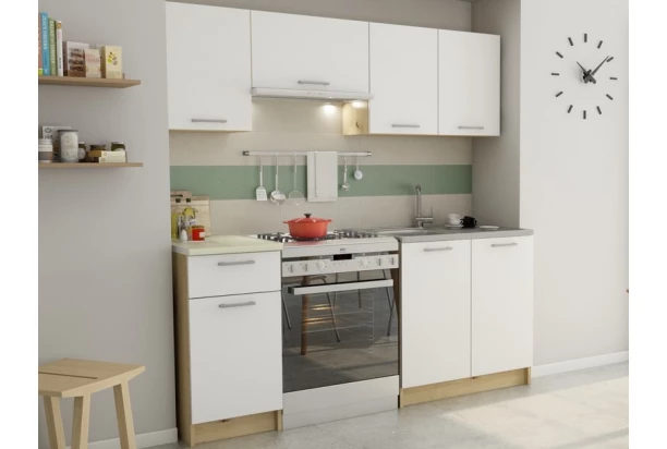 Lacný kuchynský blok Irma dokonale doplní funkčný priestor menšej kuchyne. Nábytok vyrobený v kontrastnej kombinácii dekoru dub artisan a bielej farby.