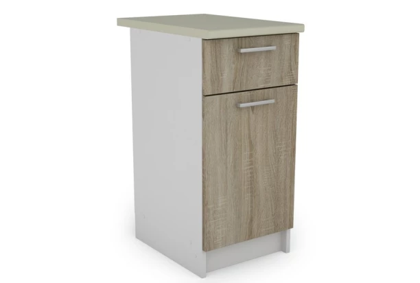 Dolná kuchynská skrinka so šírkou 40 cm dokonale dopĺňa funkčný priestor v malej kuchyni. Nábytok vyrobený v kombinácii bielej farby a dekoru dub sonoma. Vrátane zásuvky a pracovnej dosky.