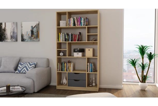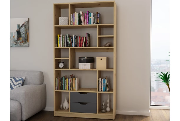 Vysoký moderný regál so šírkou 100 cm v dekore dub artisan/grafit má 2 praktické zásuvky a môže byť umiestnený k stene alebo voľne v priestore ako predel miestnosti.
