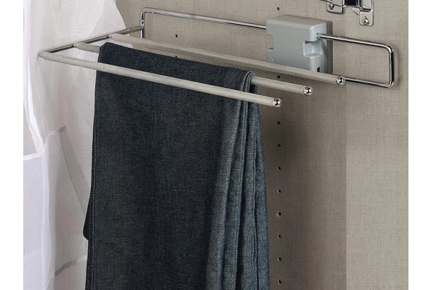 Kovový výsuvný držiak na nohavice slúži ako univerzálny doplnok ku skrini. Stačí jednoducho namontovať k vonkajšej alebo vnútornej strane steny skrine. Môže poslúžiť nielen na uloženie nohavíc, ale aj iného ošatenia alebo doplnkov.