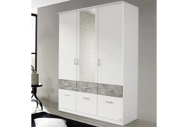 Šatníková skriňa zo série Bremen je obľúbená pre svoju praktickosť a dobrú úroveň spracovania. Vyrobená v kombinácii bielej farby a imitácie šedého betónu. Ponúka úložný priestor, 3 otočné dvere, 1 zrkadlo a 6 praktických zásuviek o rôznych veľkostiach pre prehľadné ukladanie oblečenia, bielizne a doplnkov. Z jednotlivých elementov série Bremen môžete naviac zostaviť ľubovoľne veľký šatník a prispôsobiť si tak úložné priestory podľa individuálnych potrieb.