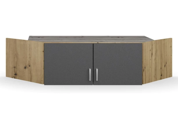 Rohový skriňový nadstavec z programu Bremen je obľúbený pre svoju praktickosť a dobré spracovanie. Vyrobený v dekore dub artisan/tmavo šedá. Ponúka úložný priestor za 2 otočnými dverami. Z jednotlivých elementov série Bremen môžete navyše zostaviť ľubovoľne veľký šatník a prispôsobiť si tak úložné priestory podľa individuálnych potrieb.