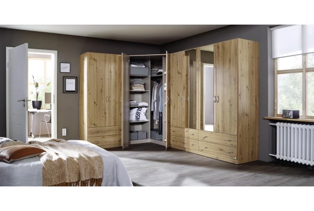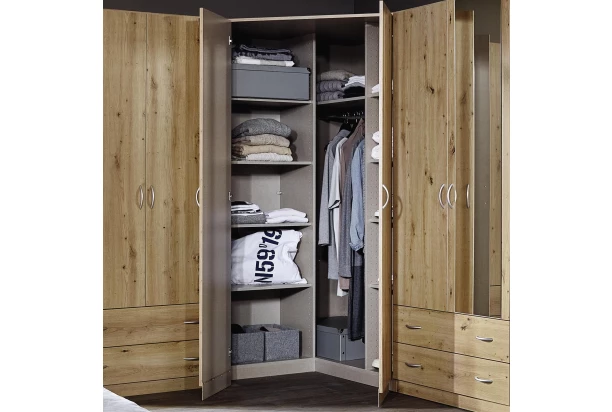 Rohová šatníková skriňa z programu Case je vyrobená v dekore dub artisan a prináša do domácnosti jednoduchú eleganciu a funkčnosť. Konštrukcia so šírkou 117 cm obsahuje 2 dvere a praktické vnútorné police.
