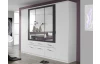 Šatník o šírke 225 cm zo spálňového programu Burano v kontrastnej kombinácii biela/tmavo šedá. Dvere so zrkadlami dopĺňajú dva rady praktických úložných zásuviek pre prehľadné ukladanie bielizne.