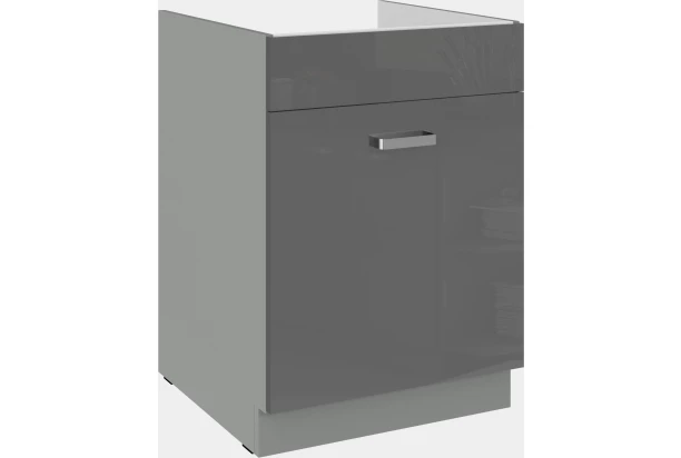 Kuchynská drezová skrinka so šírkou 60 cm z programu Grey v jednoduchom, funkčnom a modernom štýle. Predné plochy vo vysoko lesklej sivej farbe. Môžete ľubovoľne kombinovať rôzne prvky programu kuchyne Grey a zostaviť si tak kuchyňu ľubovoľnej veľkosti podľa vašich individuálnych potrieb a priestorových možností.