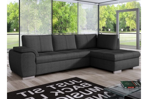 Elegantné zaoblené tvary ponúka rohová sedacia súprava Tokio s otomanom na pravej strane, vhodná aj do menšieho priestoru. Komfortne vypolstrovaný sedák a veľké oporné vankúše očalúnené grafitovo šedou tkaninou.