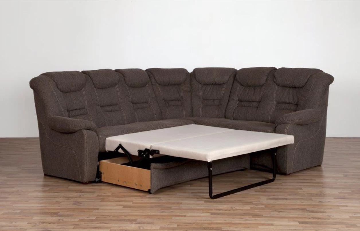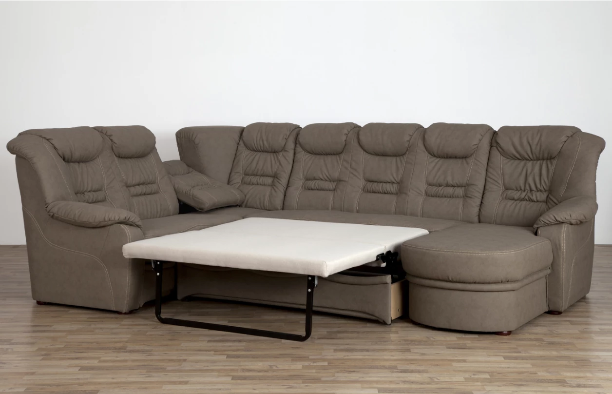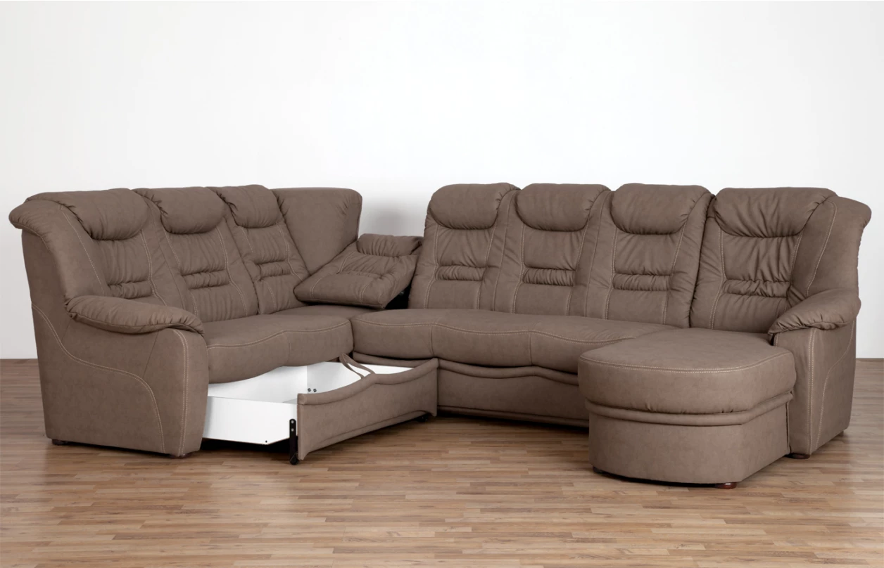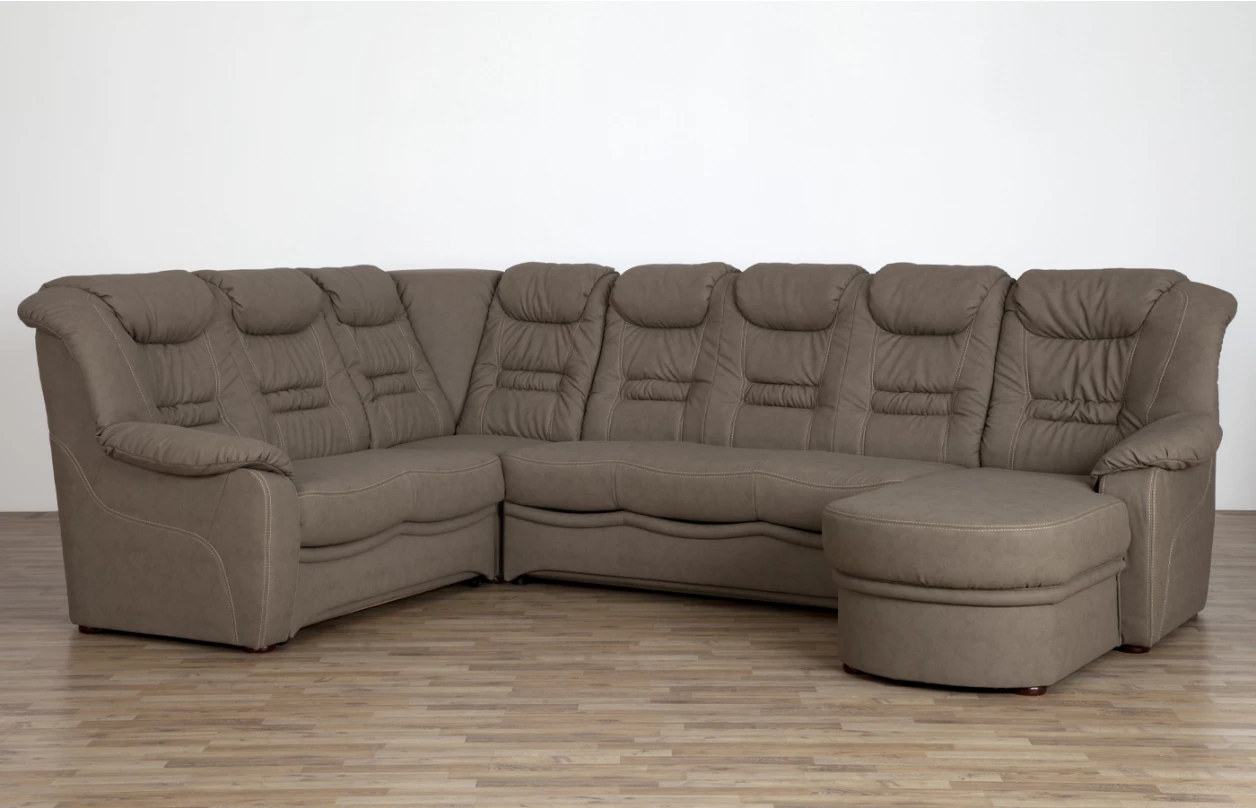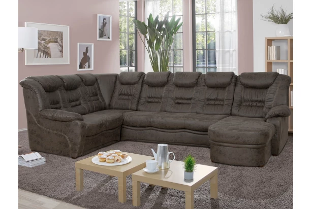 Veľmi obľúbená sedacia súprava s pôdorysom do U vyniká svojou priestrannosťou a komfortne vysokým operadlom. Očalúnená látkou v optike štruktúrovanej kože v odtieni čokoládovo hnedá. Priestranná sedačka s výrazným prešivom a otomanom na pravej strane poskytne pohodlie pre celú rodinu. Sedačka je navyše vybavená relaxačnou funkciou sklápacieho operadla, úložnou zásuvkou a rozkladacou funkciou na príležitostné spanie.