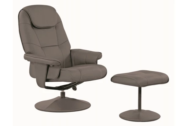 Šedé relaxačné kreslo s funkciou polohovania pre relaxáciu, ktorú si zaslúžite. Poťah z ekokože. Vrátane prístavnej podnožky.