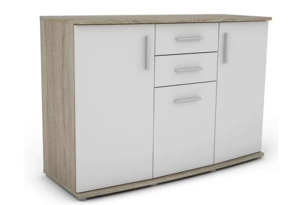 Komoda Rondo zaujme elegantným zaoblením predných hrán a je univerzálne využiteľná v každej miestnosti bytu. Obsahuje dvere i stredové zásuvky, vyrobená v prevedení dub sonoma/biela.