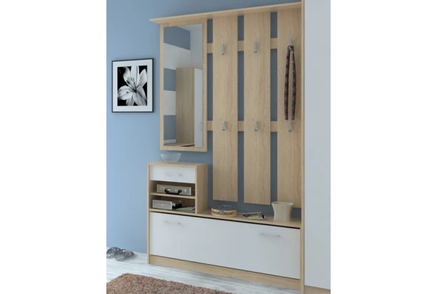 Sympatická zostava predsieňovej steny, ktorá obsahuje všetko potrebné. Dekor dub Sonoma je kombinovaný bielou farbou.
