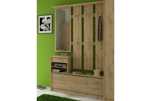 Sympatická zostava predsieňovej steny, ktorá obsahuje všetko potrebné. Vyrobená v dekore dub Wotan.