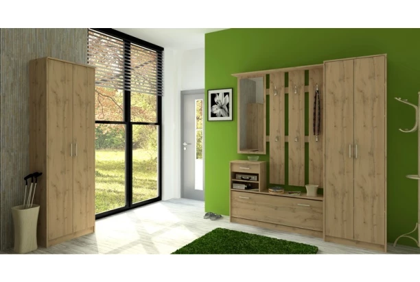 Úzka 2-dverová skriňa na kabáty, ktorá poslúži dobre v malých predsieňach alebo šatniach. V dekore dub Wotan.