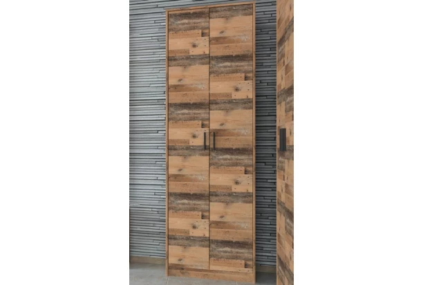 Úzka policová 2-dverová skriňa, ktorá poslúži dobre v malých priestoroch, v špajzi aj ako botník. Vyrobená vo vintage optike drevených dosiek a dokonale doplní štýlovo zariadený byt.