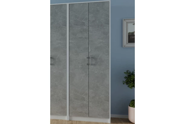 Úzka policová 2-dverová skriňa, ktorá poslúži dobre v malých priestoroch, v špajzi aj ako botník. Vyrobená imitáciu šedého betónu v kombinácii s bielymi plochami a dokonale doplní moderne zariadený byt.