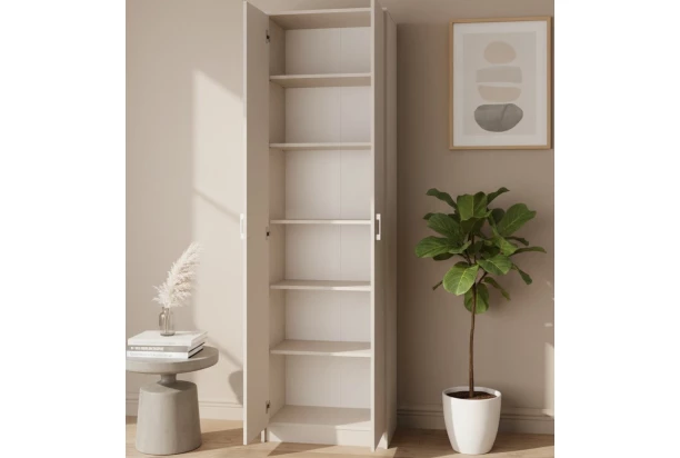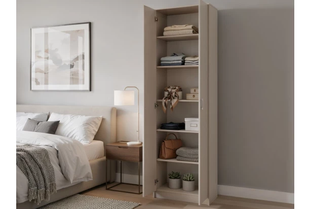 Úzka policová 2-dverová skriňa, ktorá poslúži dobre v malých priestoroch, v špajze aj ako botník. Vyrobená v kašmírovej béžovej farbe a dokonale doplní moderne zariadený byt.