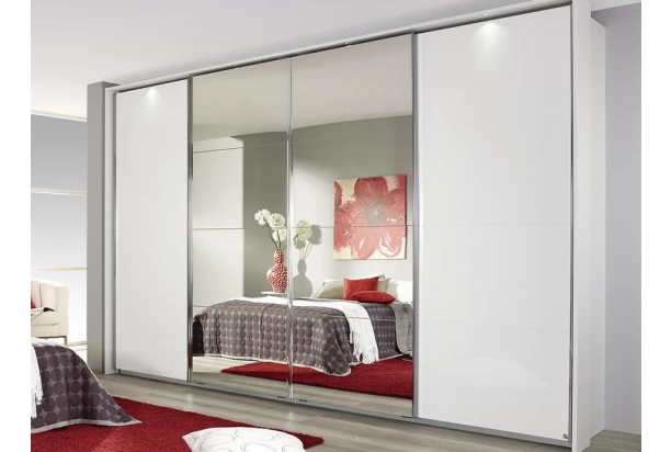 Kvalitná šatníková skriňa je vybavená synchrónnym mechanizmom pre otváranie posuvných stredových dverí pre vyšší komfort – nemusíte tak otvárať každé dvere samostatne. Konštrukcia s celkovou šírkou 316 cm vyrobená v bielej farbe, stredové dvere vybavené zrkadlami.