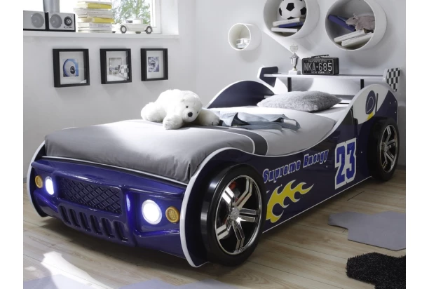 Parádna detská posteľ v tvare modrého závodného auta pre malých aj veľkých chlapcov. Prepracovaná predná maska obsahuje aj LED osvetlenie, ktoré vytvorí skvelý efekt počas večera. Štýlové polepy na bočných stranách a krásna optika športových kolies dotvára športový dizajn závodného vozidla. Zadný spojler poslúži ako praktická polička napríklad na odkladanie knižiek, lampičky, malých autíčok alebo ďalších hračiek.