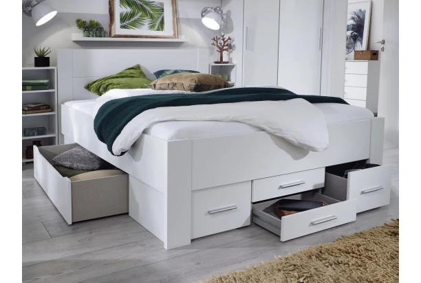 Praktická posteľ s rozmerom lôžka 140×200 cm s maximálne využitým priestorom ponúka úložné zásuvky na ukladanie každodenných alebo sezónnych vecí. V bielej farbe.