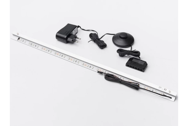 LED osvetlenie police je tvorené obojstranným LED svetelným profilom so šírkou 56 cm pre pôsobivé nasvietenie okolia sklenených políc. Farba svetla studená biela. Vrátane trafa a prívodového kábla.