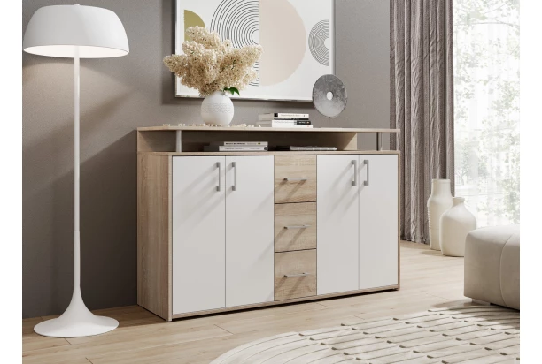Úložná komoda v dekore dub sonoma/biela je navyše doplnená hornou policou s praktickou širokou priehradkou, kam si môžete odložiť napríklad veci každodennej potreby a mať ich tak vždy po ruke.