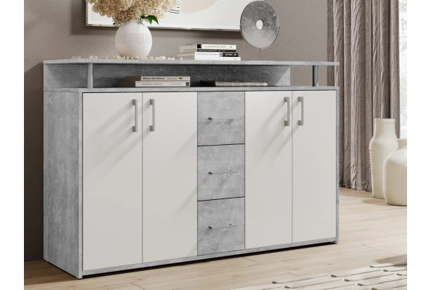 Úložná komoda v imitácii sivý betón/biela je navyše doplnená hornou policou s praktickou širokou priehradkou, kam si môžete odložiť napríklad veci každodennej potreby a mať ich tak vždy po ruke.