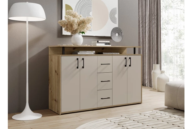 Úložná komoda v dekore dub artisan/kašmírová béžová je navyše doplnená hornou policou s praktickou širokou priehradkou, kam si môžete odložiť napríklad veci každodennej potreby a mať ich tak vždy po ruke.