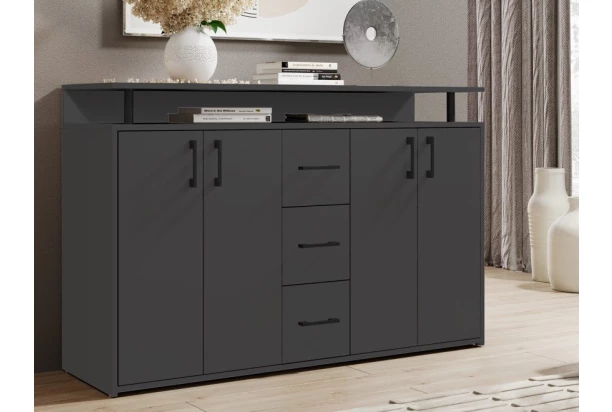 Úložná komoda vo farbe antracitová šedá je navyše doplnená hornou policou s praktickou širokou priehradkou, kam si môžete odložiť napríklad veci každodennej potreby a mať ich tak vždy po ruke.