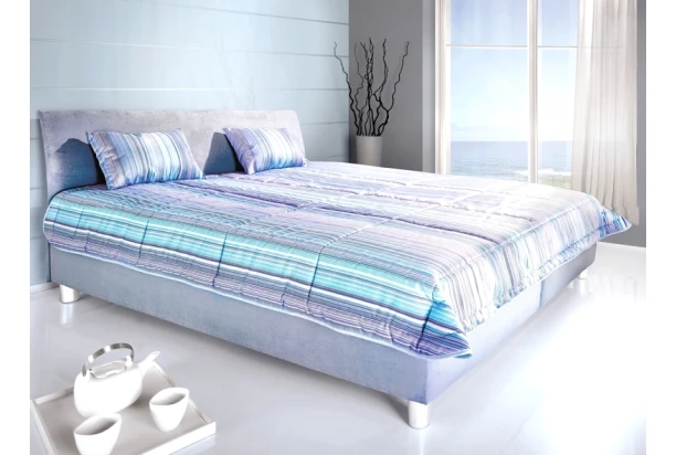 - k posteli patrí aj veľká denná deka a 2 vankúše, potiahnuté bavlnenou látkou s jemnými prúžkami, farba modro-šedo-fialová