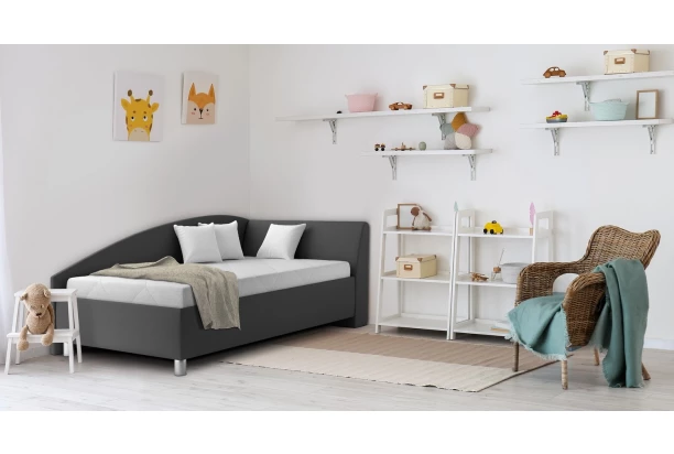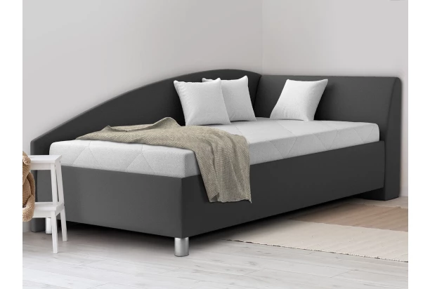 Rohová posteľ o rozmere lôžka 110×200 cm v peknom dizajne zaoblených tvarov je vybavená kvalitným matracom zo studenej peny a polohovateľným roštom. Očalúnená látkou v kombinácii tmavo šedá/svetlo šedá. Pravý variant postele s čelom na pravej strane.