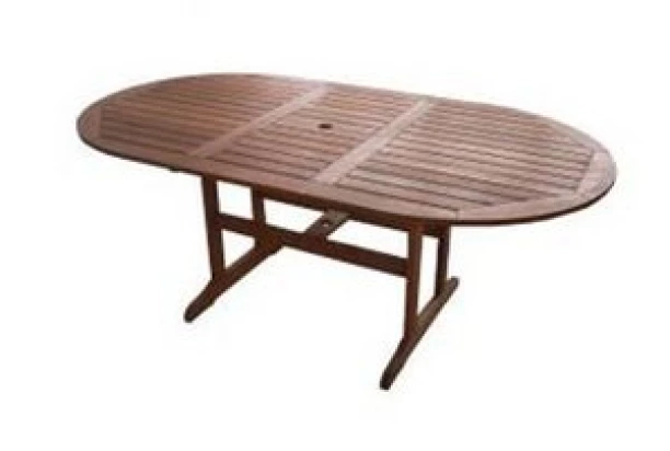Záhradný stôl v tvare oválu. Vyrobený z tvrdých tropických driev. Rozkladacia funkcia z pôvodnej šírky 150 cm až na 200 cm.