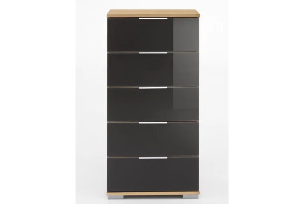 Skrinka s 5 zásuvkami z programu Easy Plus poslúži pre univerzálne ukladanie vecí alebo aj ako prehľadný bielizník. V kombinácii doskový dub a sivé sklo, ktoré dodáva komode luxusný efekt.