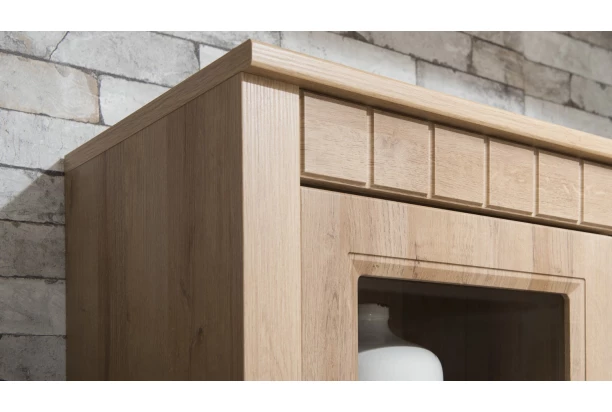 Širokú vysokú vitrínu z kolekcie Atik vo vidieckom štýle si zamilujete, vyrobená v drevodekore dub riviera. Okrasné frézované prvky, jedinečný vzhľad aj precízne spracovanie, radí tento model medzi najobľúbenejšie.