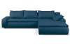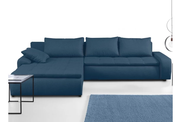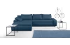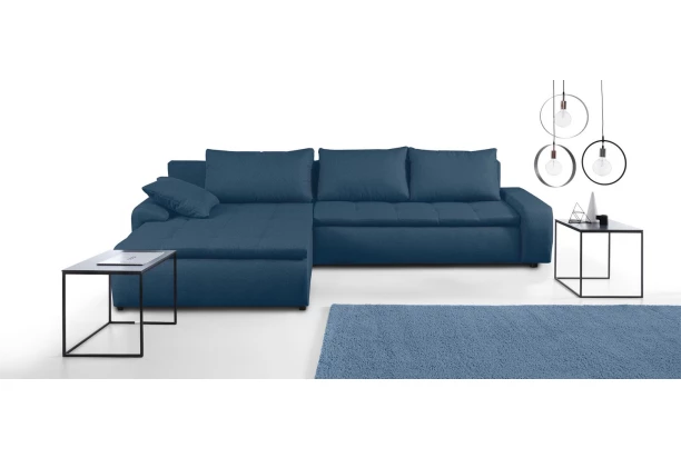 Ležérna rohová sedacia súprava v obľúbenom trendovom dizajne je ideálna pre chvíle pohody. Zaoblené tvary sedačky dopĺňa priestranný otoman, rozkladacia funkcia na lôžko aj úložný priestor. Potiahnutá jemne štruktúrovanou látkou vo farbe tmavá námornícka modrá.