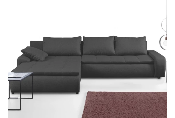 Ležérna rohová sedacia súprava v obľúbenom trendovom dizajne je ideálna pre chvíle pohody. Zaoblené tvary sedačky dopĺňa priestranný otoman, rozkladacia funkcia na lôžko aj úložný priestor. Potiahnutá jemne štruktúrovanou látkou vo farbe antracitová tmavo šedá.