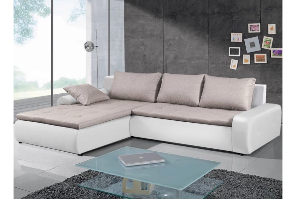 Ležérna rohová sedacia súprava pre chvíle pohody v obľúbenom trendovom štýle. Doplnená o rozkladaciu funkciu a úložný priestor. Očalúnenie kombináciou biela ekokoža/mäkučká krémová látka. Priestranný otoman možné univerzálne umiestniť a vytvoriť si tak pravý alebo ľavý roh sedačky.