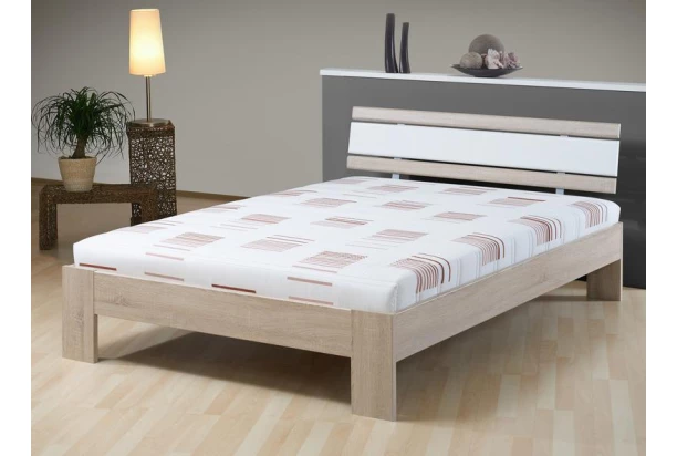 Posteľ v dubovom dekore príjemne ladí s bielym pruhom zadného čela. Dodáva sa vrátane roštu aj pružinového matraca.