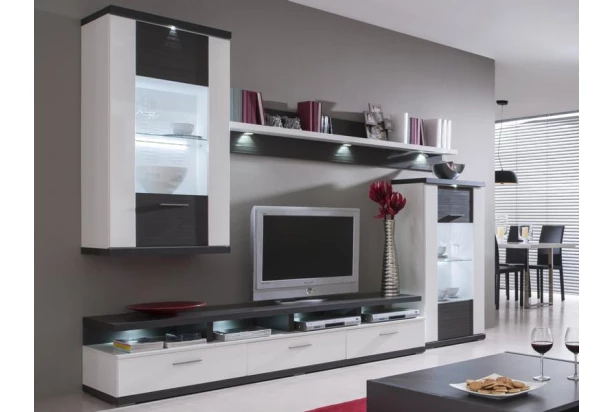 Ak chcete kvalitný a zároveň moderný dizajnový nábytok, potom je obývacia stena Caracas práve pre vás. Silné horné rámy konštrukcie obsahujú bodové LED svetlá, ktoré na štruktúrovanom povrchu nábytku hrajú hru svetla a tieňov a vytvárajú tak naozaj exkluzívny efekt. Nábytok zároveň zostáva účelný, univerzálny a praktický. V kombinácii šedého grafitu a lesklo bielej farby.