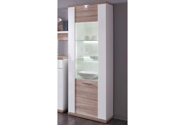 Vysoká vitrína Caracas typ 01, dub/biely lesk, s osvetlením