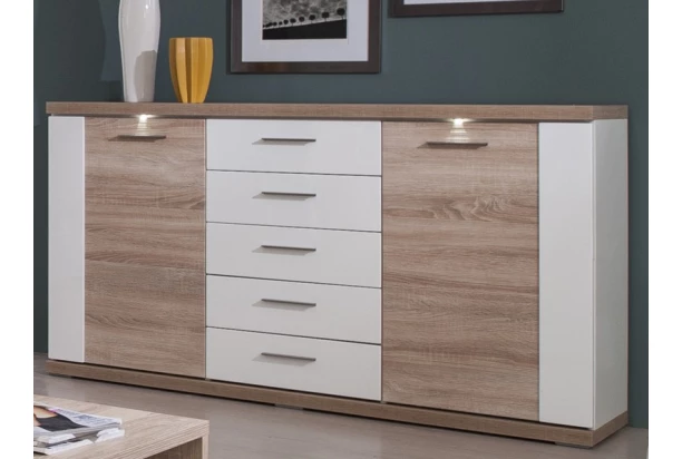 Široká komoda Caracas typ 21, dub/biely lesk, s osvetlením