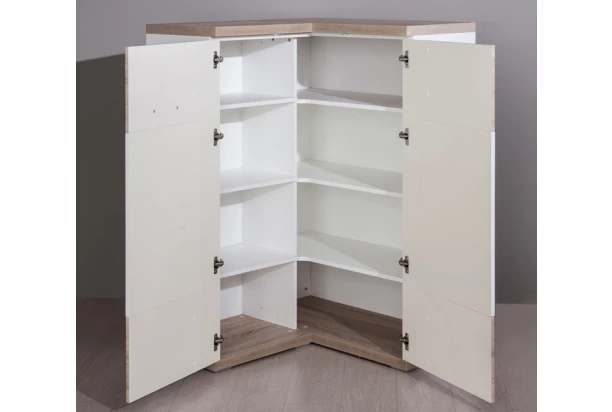 Ak chcete kvalitný a zároveň moderný dizajnový nábytok, potom je rohová komoda Caracas práve pre vás. Silné horné rámy konštrukcie obsahujú bodové LED svetlá, ktoré na štruktúrovanom povrchu nábytku hrajú hru svetla a tieňov a vytvárajú tak naozaj exkluzívny efekt. Nábytok zároveň zostáva účelný, univerzálny a praktický. V kombinácii dubového dekoru a lesklo bielej farby.