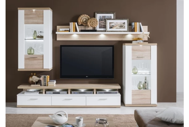 Police z programu Caracas o šírke 132,5 cm so zadným nástenným panelom. Silné rámy kvalitná konštrukcia vyrobené v kombinácii dubového dekoru a bielej farby.