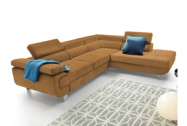 Rohová sedacia súprava Lotos v módnom dizajne as polohovateľnými opierkami pre vaše pohodlie. Sedačka s otomanom vytvára pravý roh a je očalúnená látkou s efektom brúsenej kože vo farbe horčicovo žltá. Navyše vybavená rozkladacou funkciou a praktickým úložným priestorom vo svojej dolnej časti, čo ocení každá domácnosť.