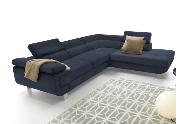 Rohová sedacia súprava Lotos v módnom dizajne as polohovateľnými opierkami pre vaše pohodlie. Sedačka s otomanom vytvára pravý roh a je očalúnená látkou s efektom brúsenej kože vo farbe temne modrá. Navyše vybavená rozkladacou funkciou a praktickým úložným priestorom vo svojej dolnej časti, čo ocení každá domácnosť.
