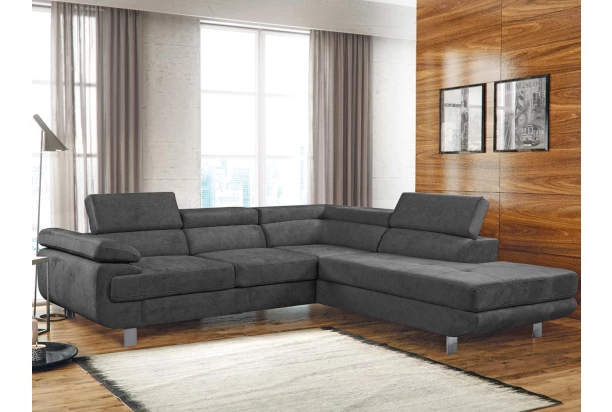 Rohová sedacia súprava Lotos v módnom dizajne as polohovateľnými opierkami pre vaše pohodlie. Sedačka s otomanom vytvára pravý roh a je očalúnená látkou s efektom brúsenej kože vo farbe tmavo šedá. Navyše vybavená rozkladacou funkciou a praktickým úložným priestorom vo svojej dolnej časti, čo ocení každá domácnosť.