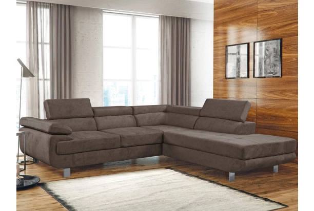 Rohová sedacia súprava Lotos v módnom dizajne as polohovateľnými opierkami pre vaše pohodlie. Sedačka s otomanom vytvára pravý roh a je očalúnená látkou s efektom brúsenej kože vo farbe hnedá. Navyše vybavená rozkladacou funkciou a praktickým úložným priestorom vo svojej dolnej časti, čo ocení každá domácnosť.