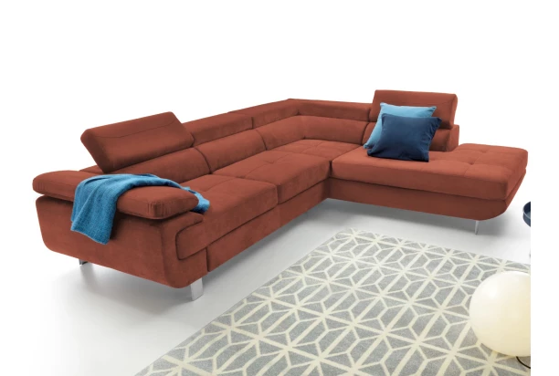 Rohová sedacia súprava Lotos v módnom dizajne a s polohovateľnými opierkami pre vaše pohodlie. Sedačka s otomanom vytvára pravý roh a je očalúnená látkou s efektom brúsenej kože vo farbe terakota. Navyše vybavená rozkladacou funkciou a praktickým úložným priestorom vo svojej dolnej časti, čo ocení každá domácnosť.