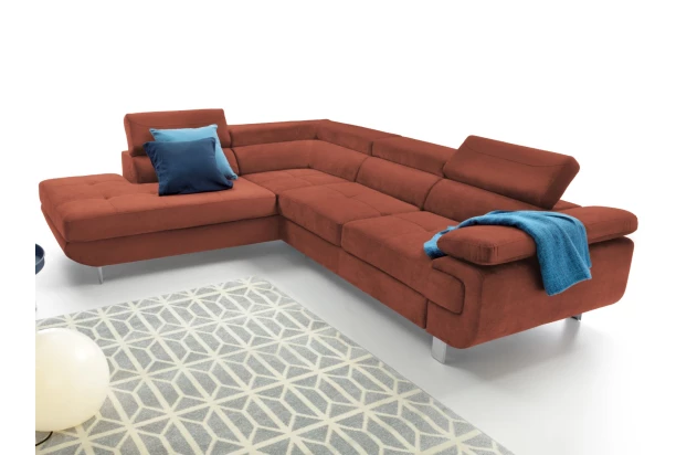 Rohová sedacia súprava Lotos v módnom dizajne as polohovateľnými opierkami pre vaše pohodlie. Sedačka s otomanom vytvára ľavý roh a je očalúnená látkou s efektom brúsenej kože vo farbe terakota. Navyše vybavená rozkladacou funkciou a praktickým úložným priestorom vo svojej dolnej časti, čo ocení každá domácnosť.