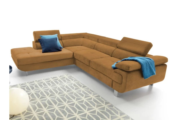 Rohová sedacia súprava Lotos v módnom dizajne as polohovateľnými opierkami pre vaše pohodlie. Sedačka s otomanom vytvára ľavý roh a je očalúnená látkou s efektom brúsenej kože vo farbe horčicovo žltá. Navyše vybavená rozkladacou funkciou a praktickým úložným priestorom vo svojej dolnej časti, čo ocení každá domácnosť.