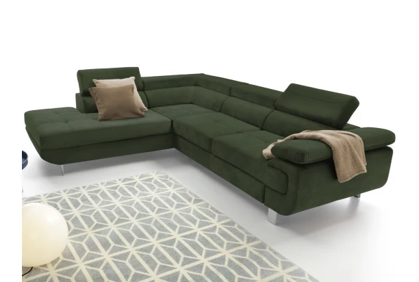 Rohová sedacia súprava Lotos v módnom dizajne a s polohovateľnými opierkami pre vaše pohodlie. Sedačka s otomanom vytvára ľavý roh a je očalúnená látkou s efektom brúsenej kože vo farbe fľaškovo zelená. Navyše vybavená rozkladacou funkciou a praktickým úložným priestorom vo svojej dolnej časti, čo ocení každá domácnosť.