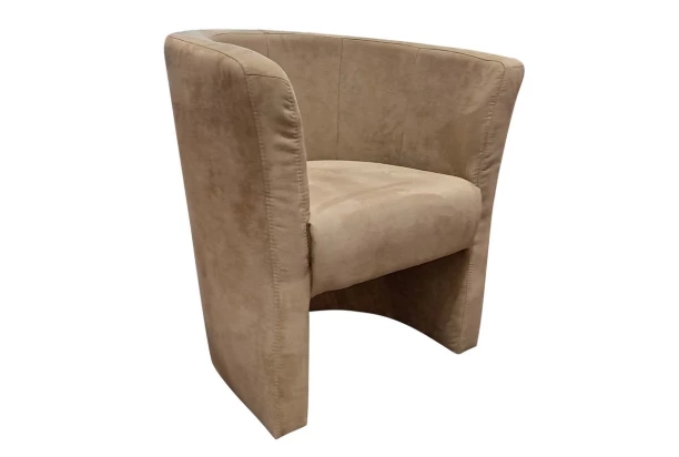 Malé zaoblené kreslo je očalúnené béžovou látkou v optike brúsenej kože. Ľahko ho umiestnite aj do menšieho priestoru.